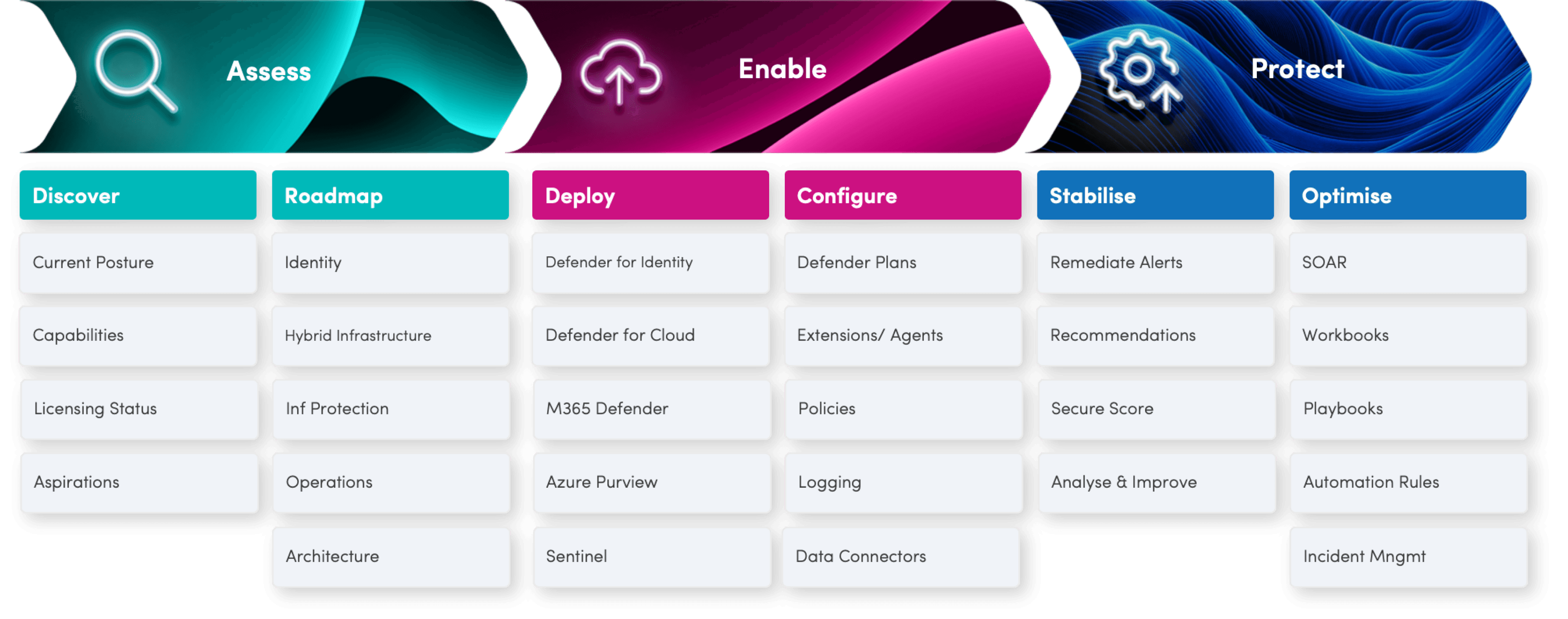 We begin by analysing and reviewing your organisation’s current security capabilities and posture. This includes evaluating your current security investments and license coverage or gaps, providing a cost analysis of replacing existing security tools with Microsoft Security solutions. If you are already licensed for the Microsoft Security solutions, we help you maximise that investment. We then develop a roadmap to ensure these security capabilities are deployed and configured correctly working towards the Microsoft Cybersecurity reference architecture to minimise any gaps which in turn eliminates any risks.